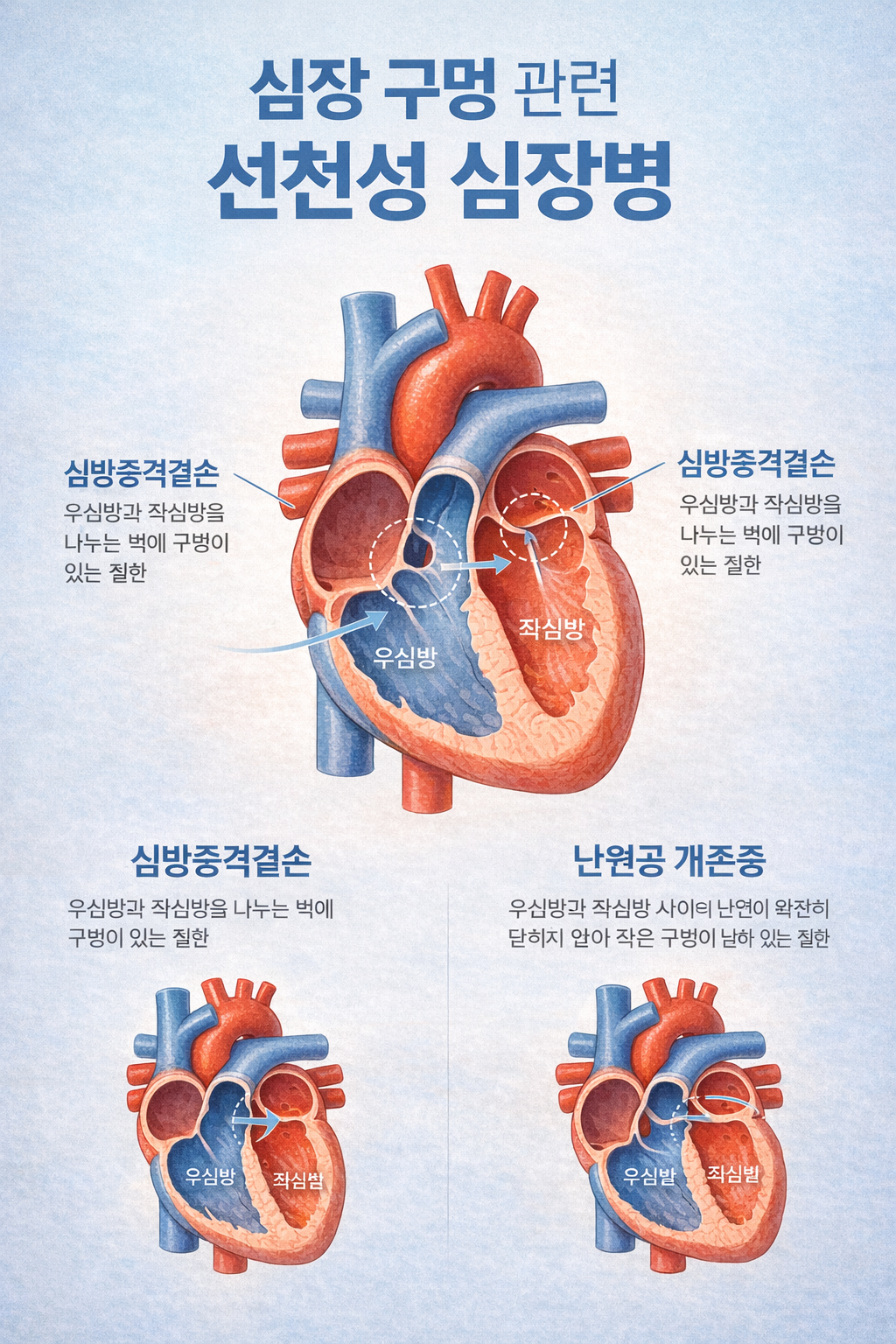 많은 부모들이 아이의 심장에 구멍이 있다는 진단을 받으면 극도의 불안감에 휩싸입니다. 그러나 심장 구멍은 종류와 위치, 크기에 따라 치료 방향이 완전히 다르며, 상당수는 자연적으로 닫히거나 치료 없이도 평생 건강하게 살아갈 수 있습니다. 이 글에서는 난원공 개존증, 심방중격 결손, 심실중격 결손의 차이와 경과, 치료 방법을 상세히 알아보겠습니다.